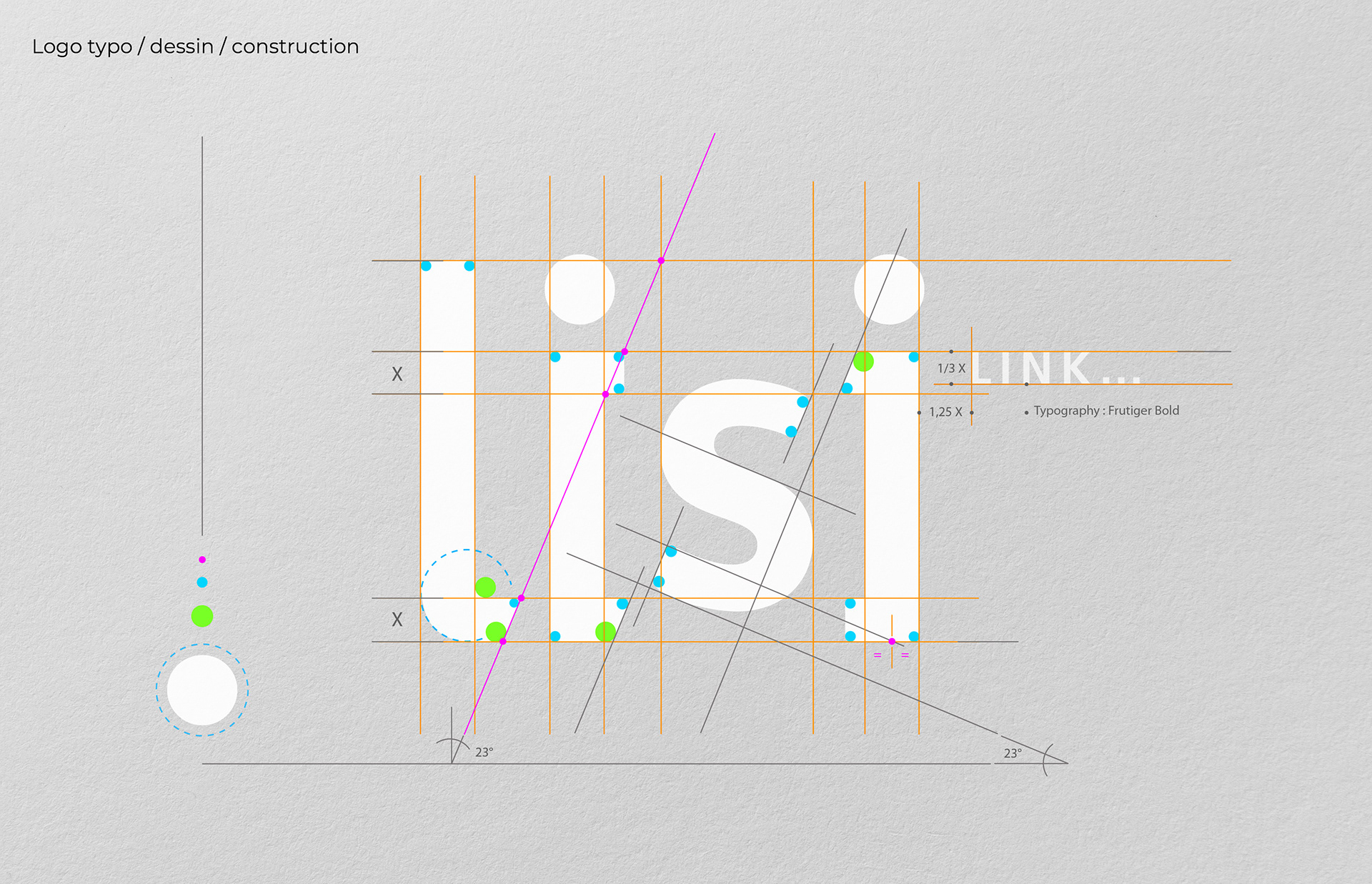 Système graphique, Solution, Solidité, Sont ancrées dans les liens humains unis par la communication et l’imagination. Les deux « i » représentent ce lien entre les humains, guidant la recherche pour finalement trouver et contenir la Solution. Ici c'est par l'utilisation des lignes comme accolades que l'on obtient la structure d’un système graphique très proche de la marque, solide, encadrant, rassurant.
