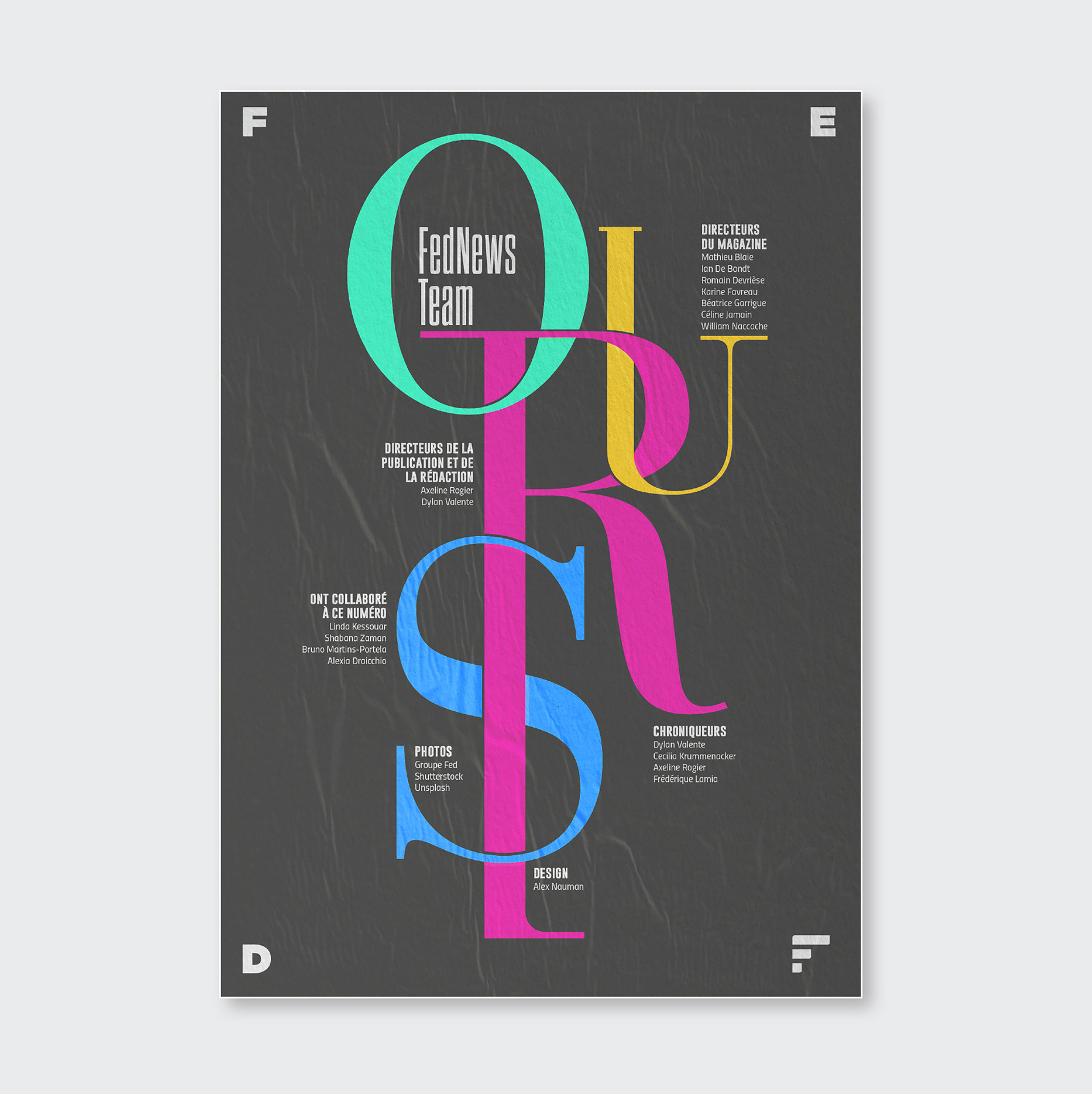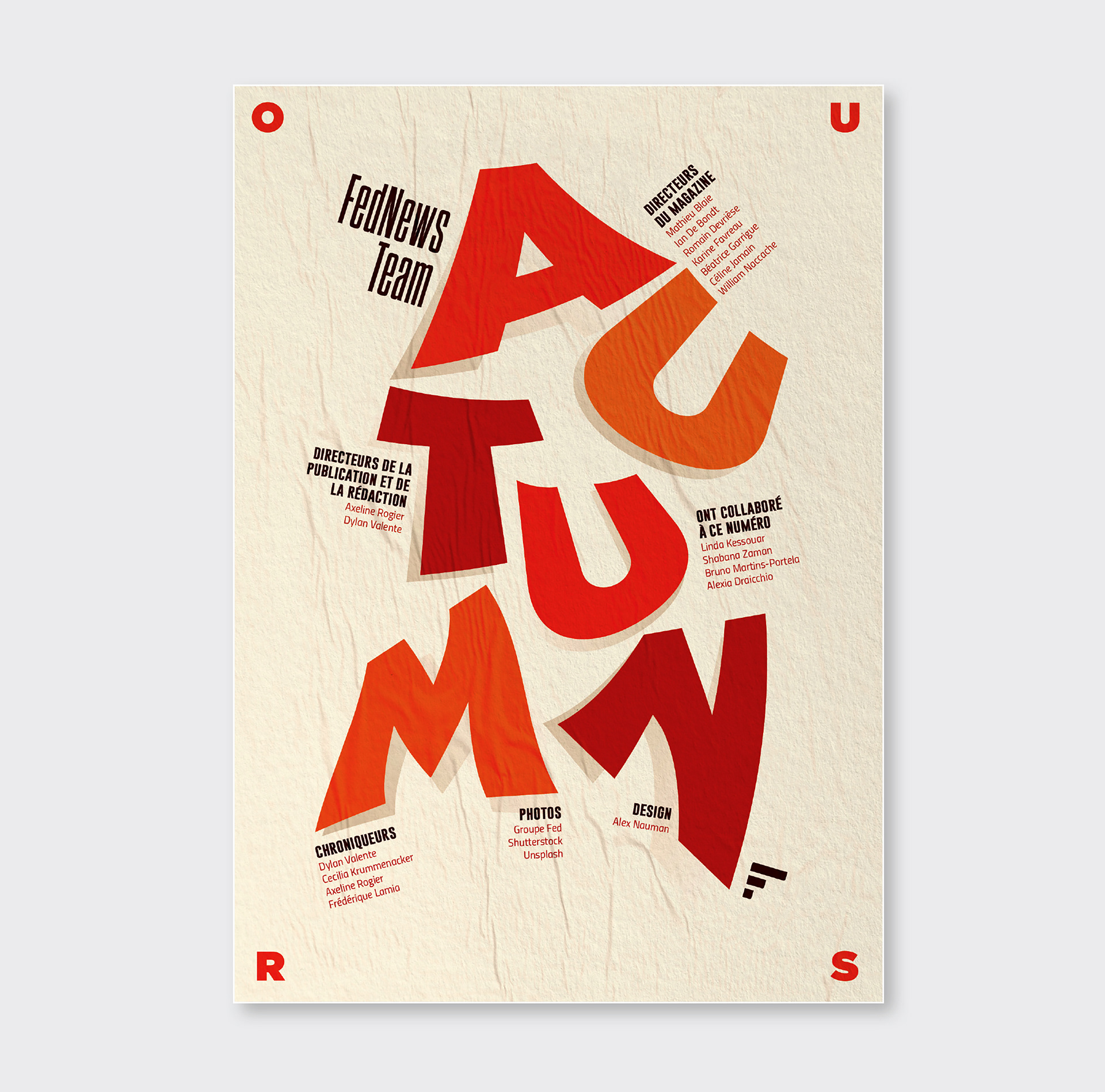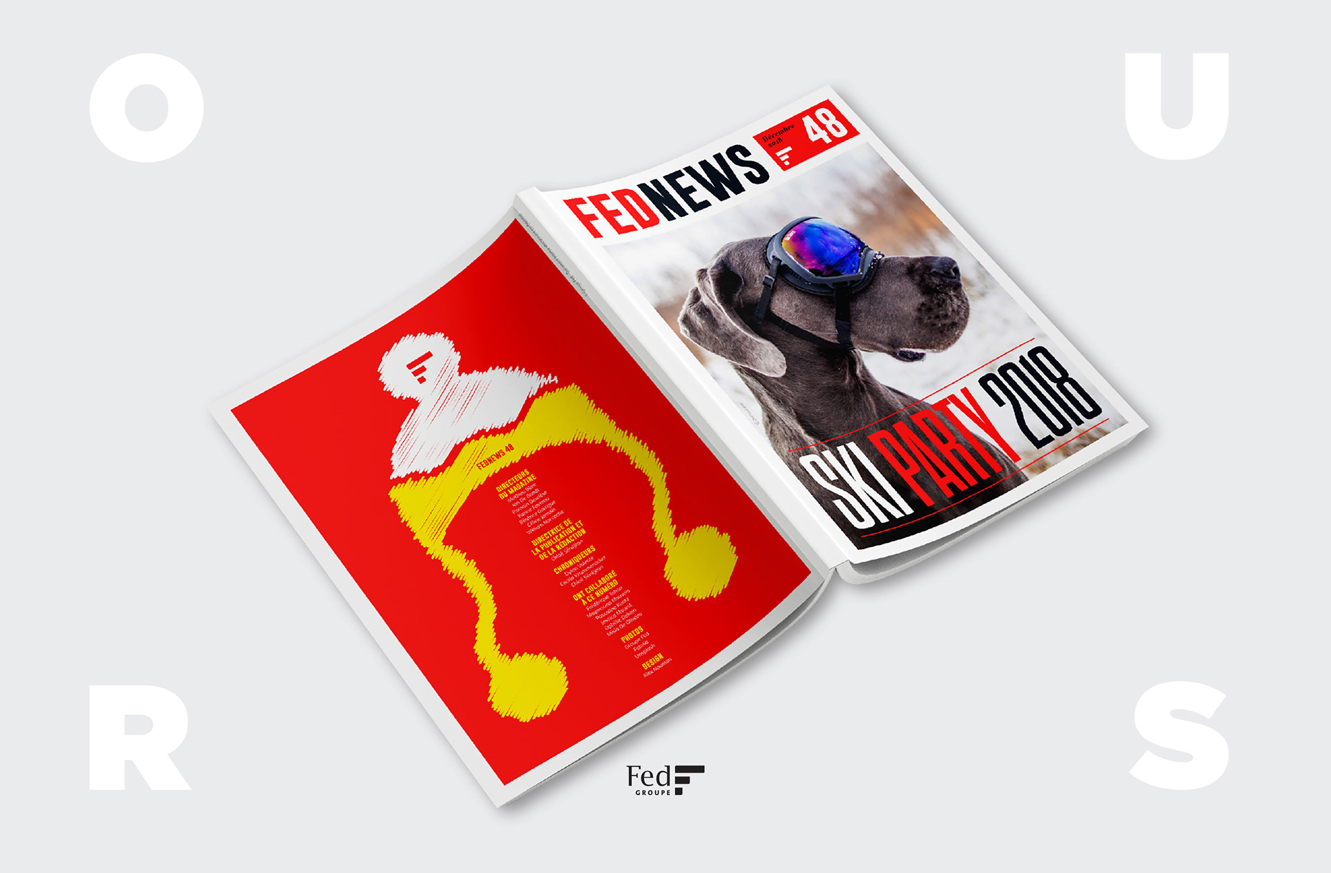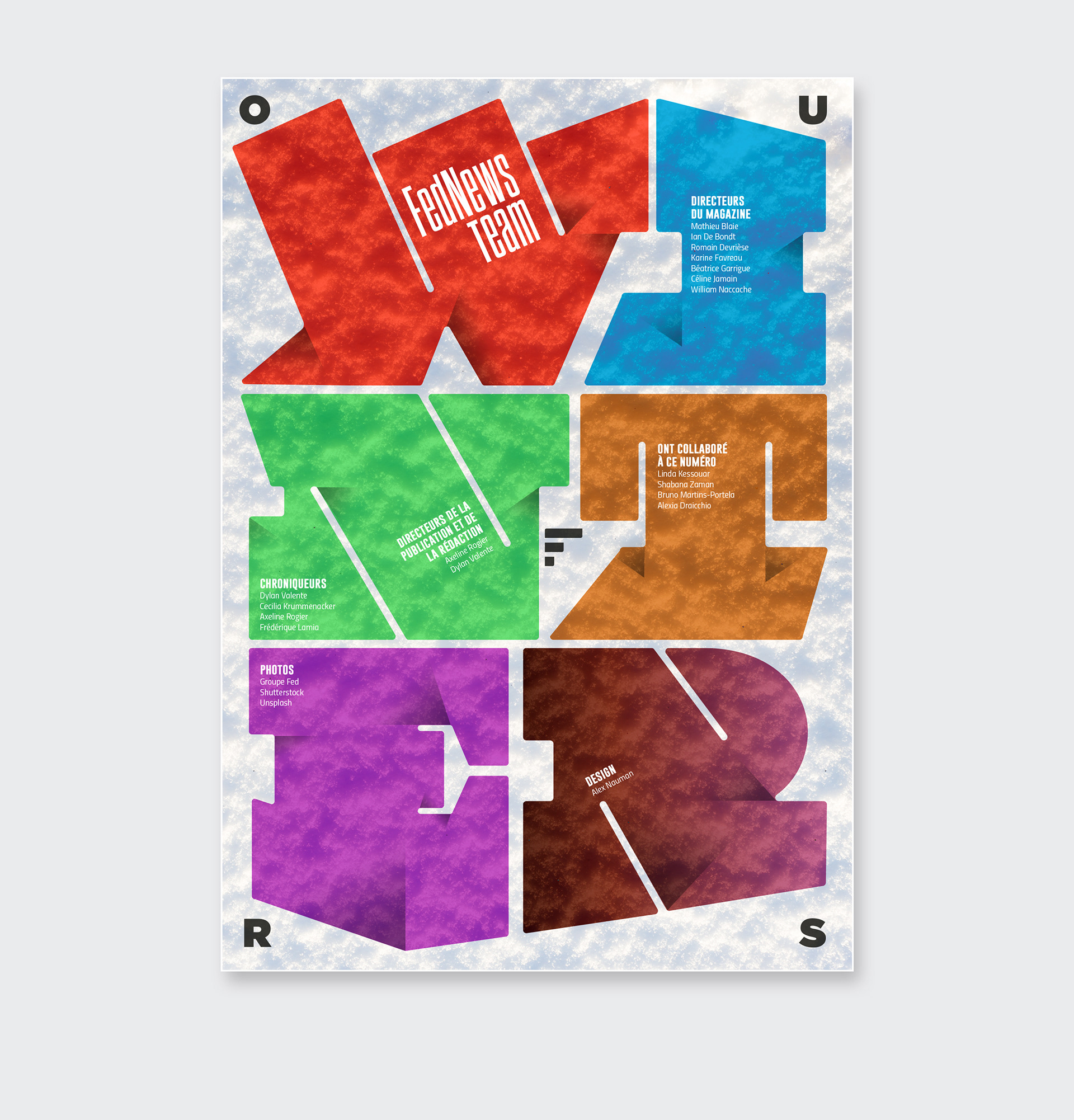 Pendant 14 ans, FedNews a été un véritable terrain d’expression graphique et éditorial. Sur les 52 numéros publiés, sur la petite dizaine de sa fin de vie, s'était développé quelques principes récurrents dont notamment un qui se hisse en quatrième de couverture. Ce principe, l"OURS", qui signifie en anglais "nous" et qui normalement est placé discrètement dans une des premières page d'un magazine prend ici une toute autre dimension en mettant en lumière tous les collaborateurs internes et externes qui ont contribué à la réalisation pour chaque numéro. Suite à l’arrêt du magazine, j’ai décidé d’explorer ce principe dans une série de recherches personnelles, où l’OURS devient un jeu typographique autour des saisons. Ce travail, ludique et créatif, prolonge l’esprit vivant et singulier du magazine en me focalisant sur cette 4ème de couverture devenant ainsi un nouveau terrain de recherches graphiques.