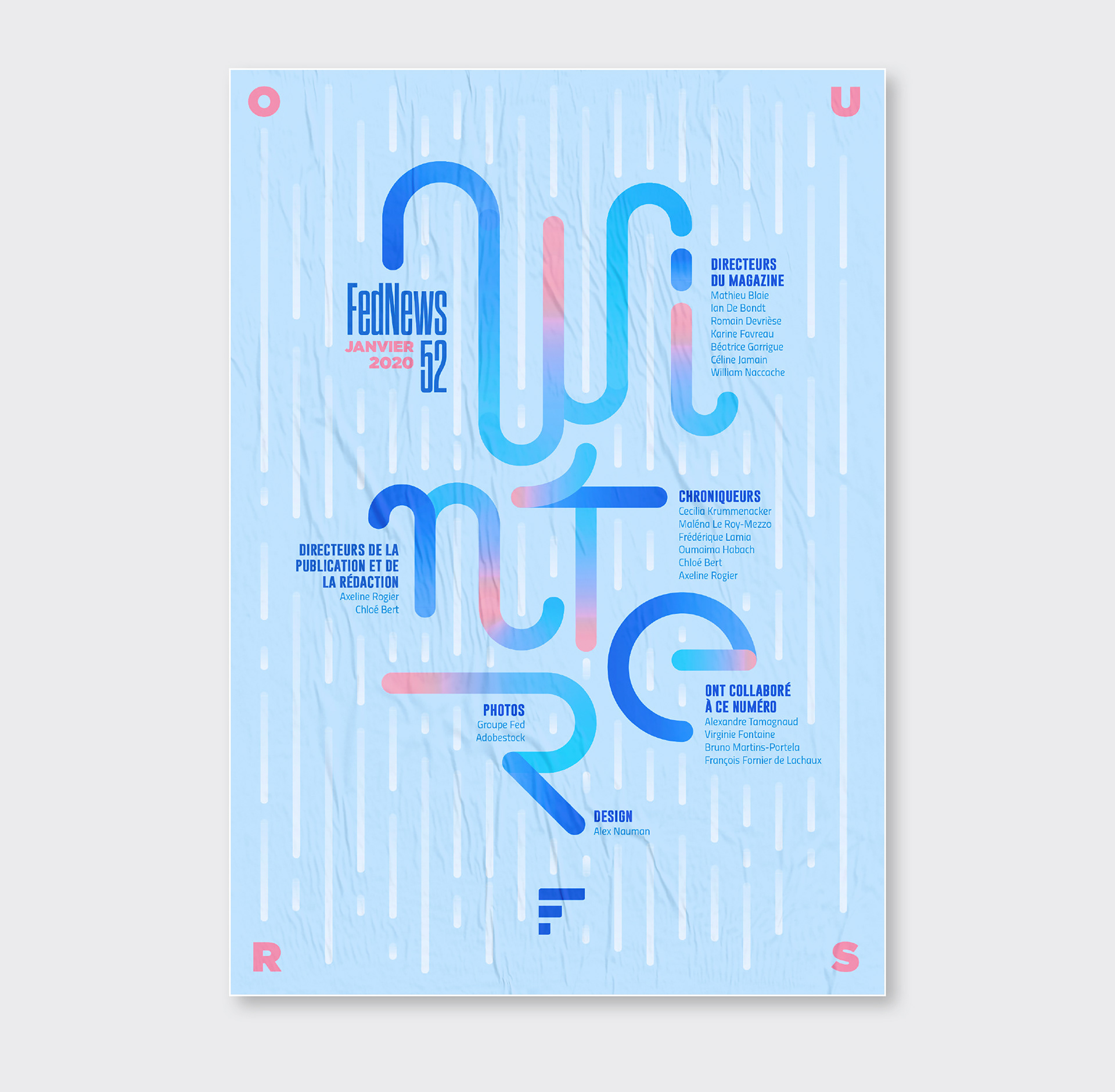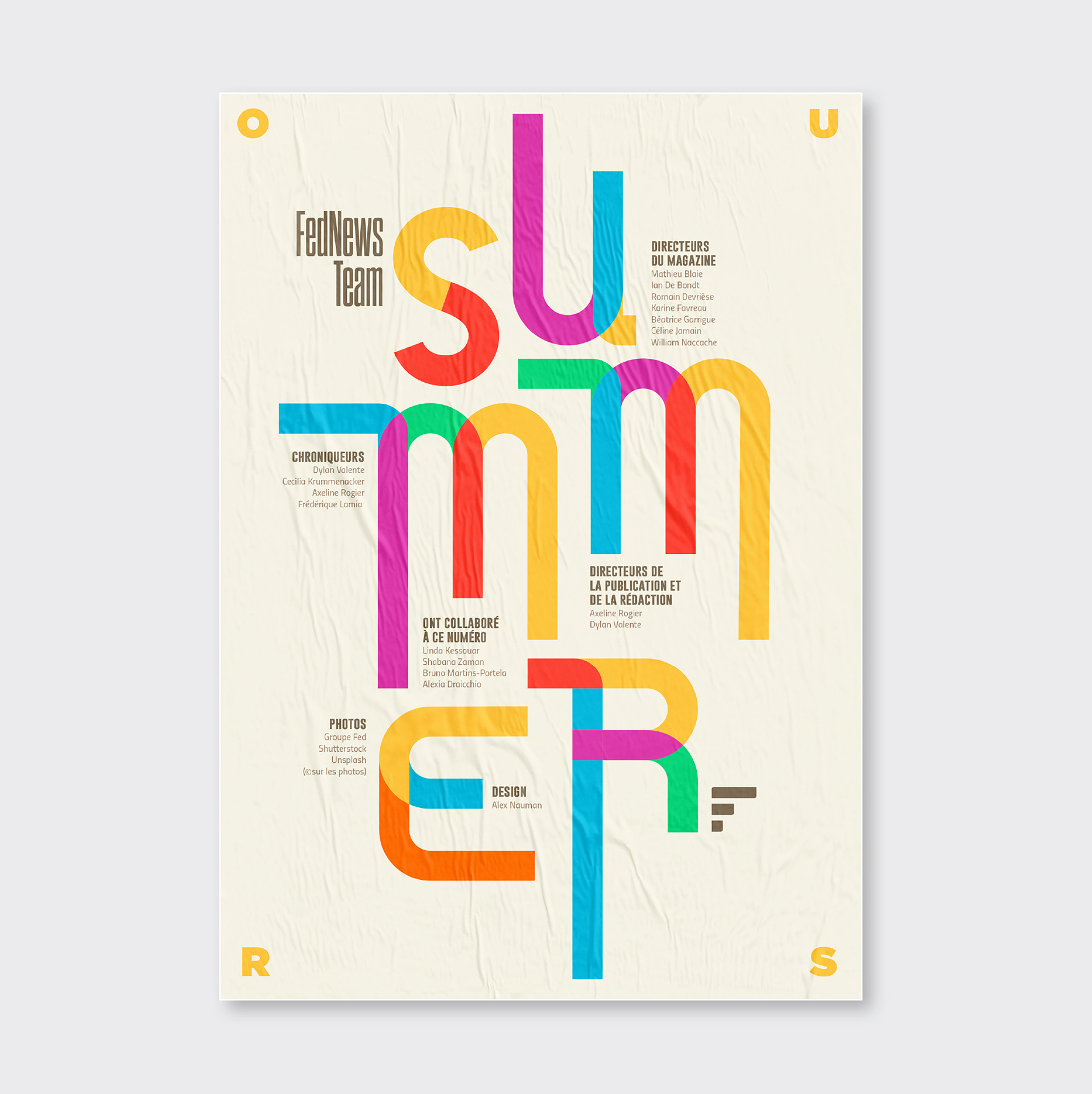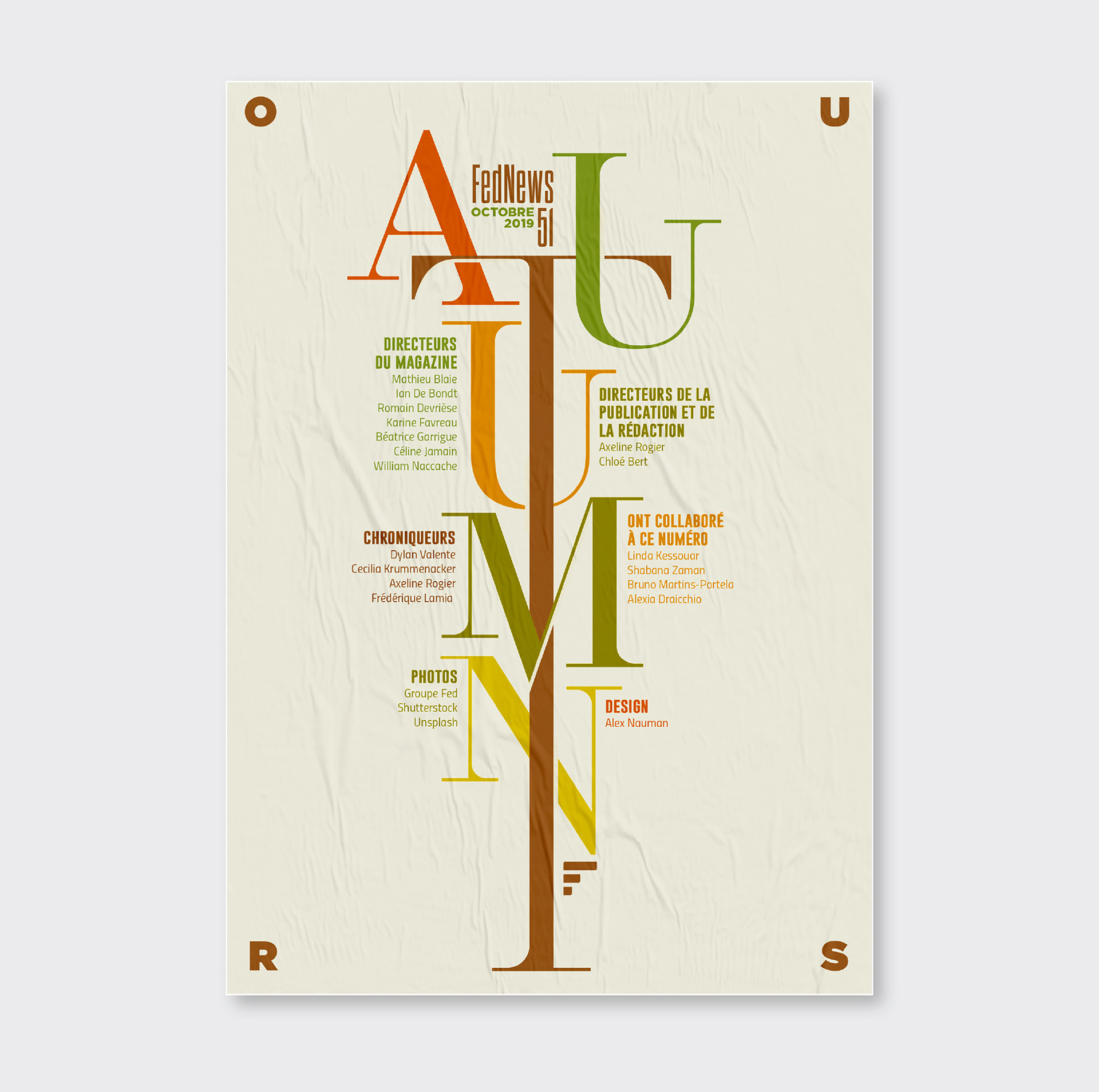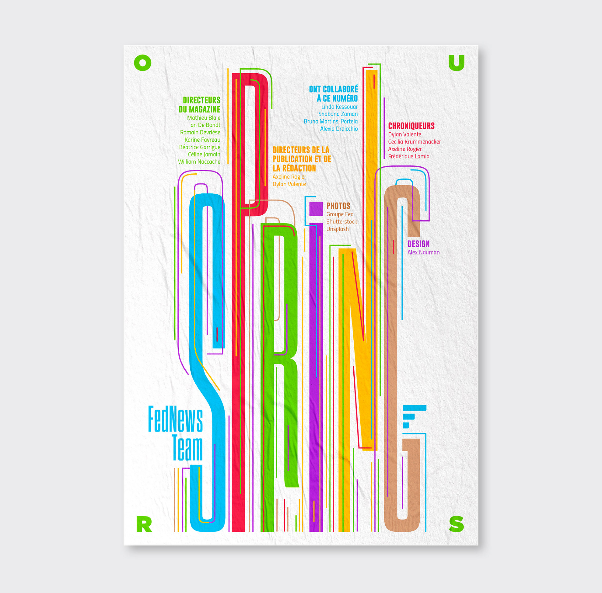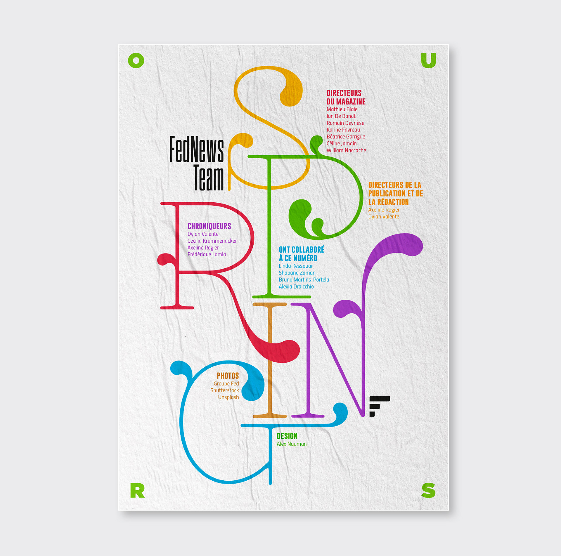 Pendant 14 ans, FedNews a été un véritable terrain d’expression graphique et éditorial. Sur les 52 numéros publiés, sur la petite dizaine de sa fin de vie, s'était développé quelques principes récurrents dont notamment un qui se hisse en quatrième de couverture. Ce principe, l"OURS", qui signifie en anglais "nous" et qui normalement est placé discrètement dans une des premières page d'un magazine prend ici une toute autre dimension en mettant en lumière tous les collaborateurs internes et externes qui ont contribué à la réalisation pour chaque numéro. Suite à l’arrêt du magazine, j’ai décidé d’explorer ce principe dans une série de recherches personnelles, où l’OURS devient un jeu typographique autour des saisons. Ce travail, ludique et créatif, prolonge l’esprit vivant et singulier du magazine en me focalisant sur cette 4ème de couverture devenant ainsi un nouveau terrain de recherches graphiques.