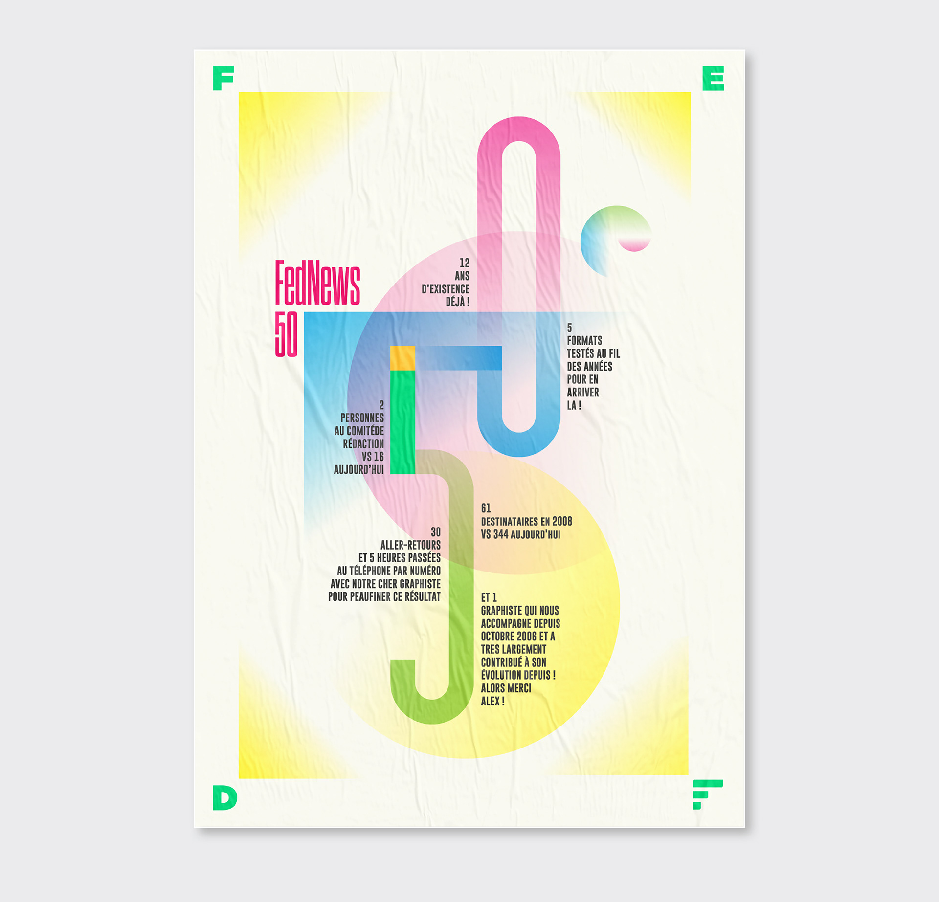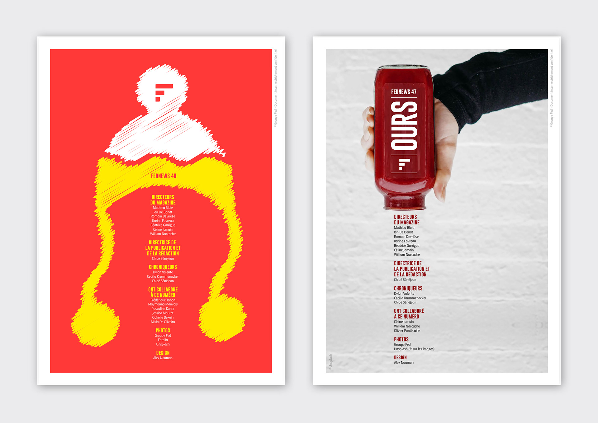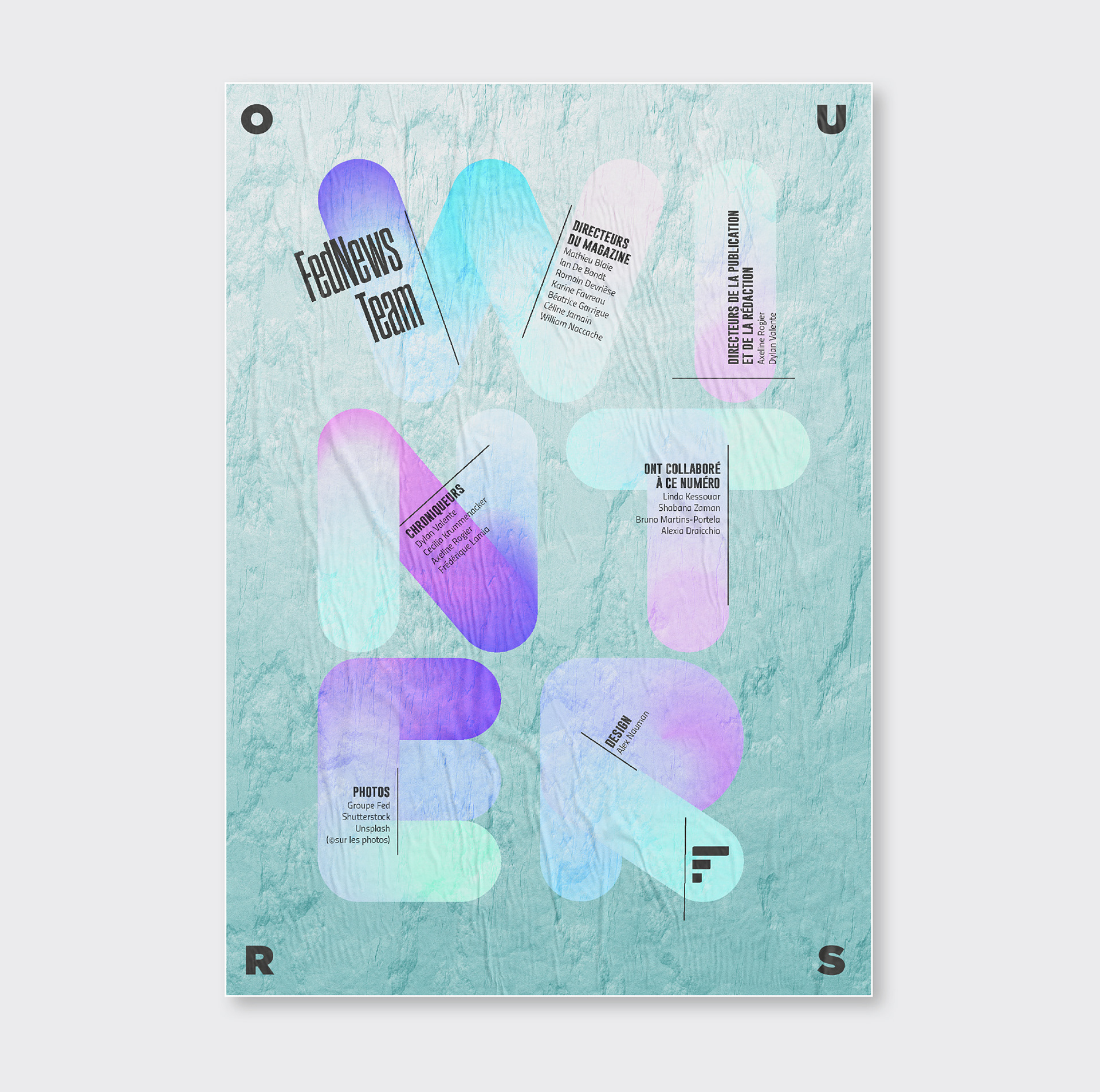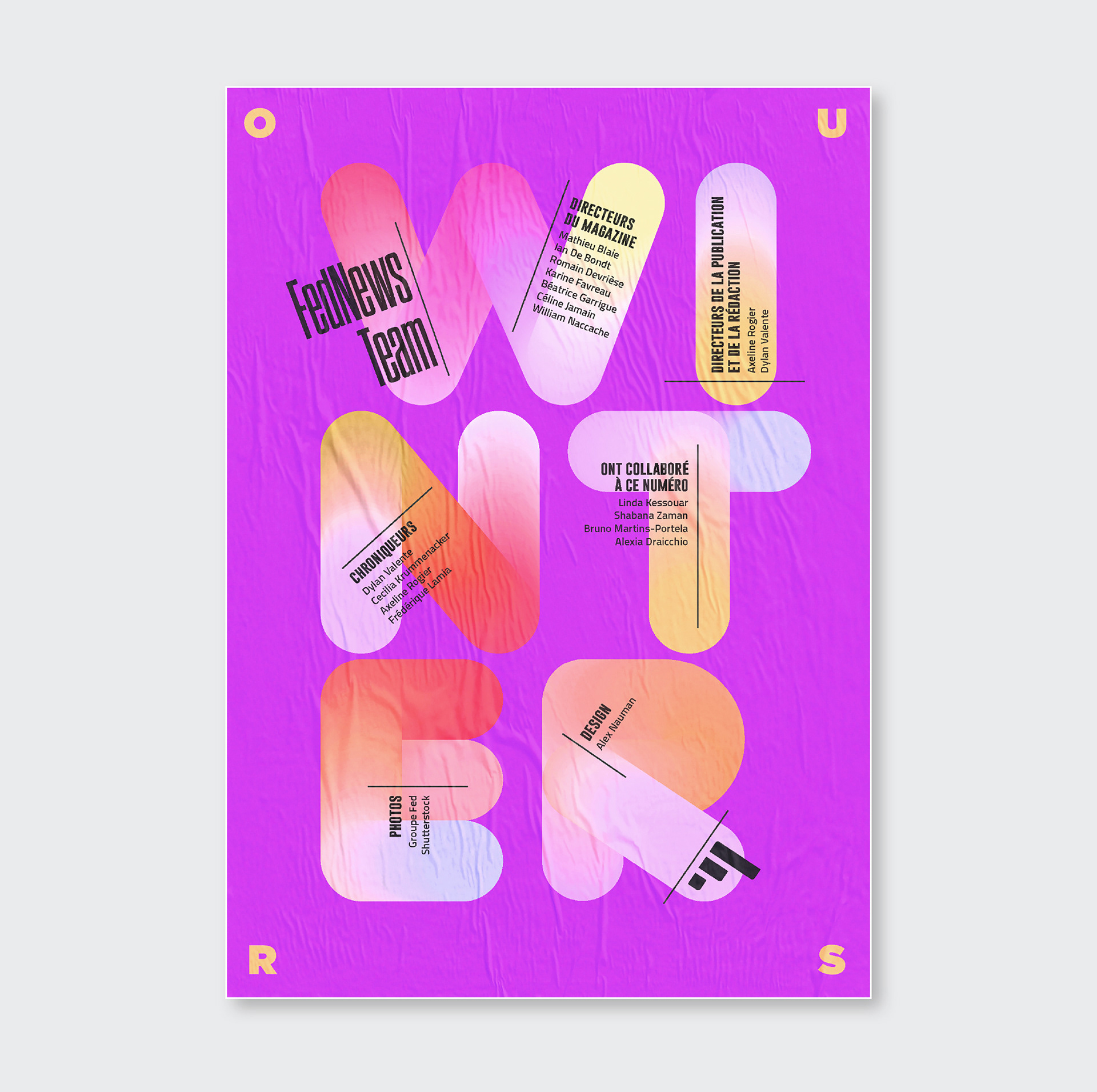 Pendant 14 ans, FedNews a été un véritable terrain d’expression graphique et éditorial. Sur les 52 numéros publiés, sur la petite dizaine de sa fin de vie, s'était développé quelques principes récurrents dont notamment un qui se hisse en quatrième de couverture. Ce principe, l"OURS", qui signifie en anglais "nous" et qui normalement est placé discrètement dans une des premières page d'un magazine prend ici une toute autre dimension en mettant en lumière tous les collaborateurs internes et externes qui ont contribué à la réalisation pour chaque numéro. Suite à l’arrêt du magazine, j’ai décidé d’explorer ce principe dans une série de recherches personnelles, où l’OURS devient un jeu typographique autour des saisons. Ce travail, ludique et créatif, prolonge l’esprit vivant et singulier du magazine en me focalisant sur cette 4ème de couverture devenant ainsi un nouveau terrain de recherches graphiques.