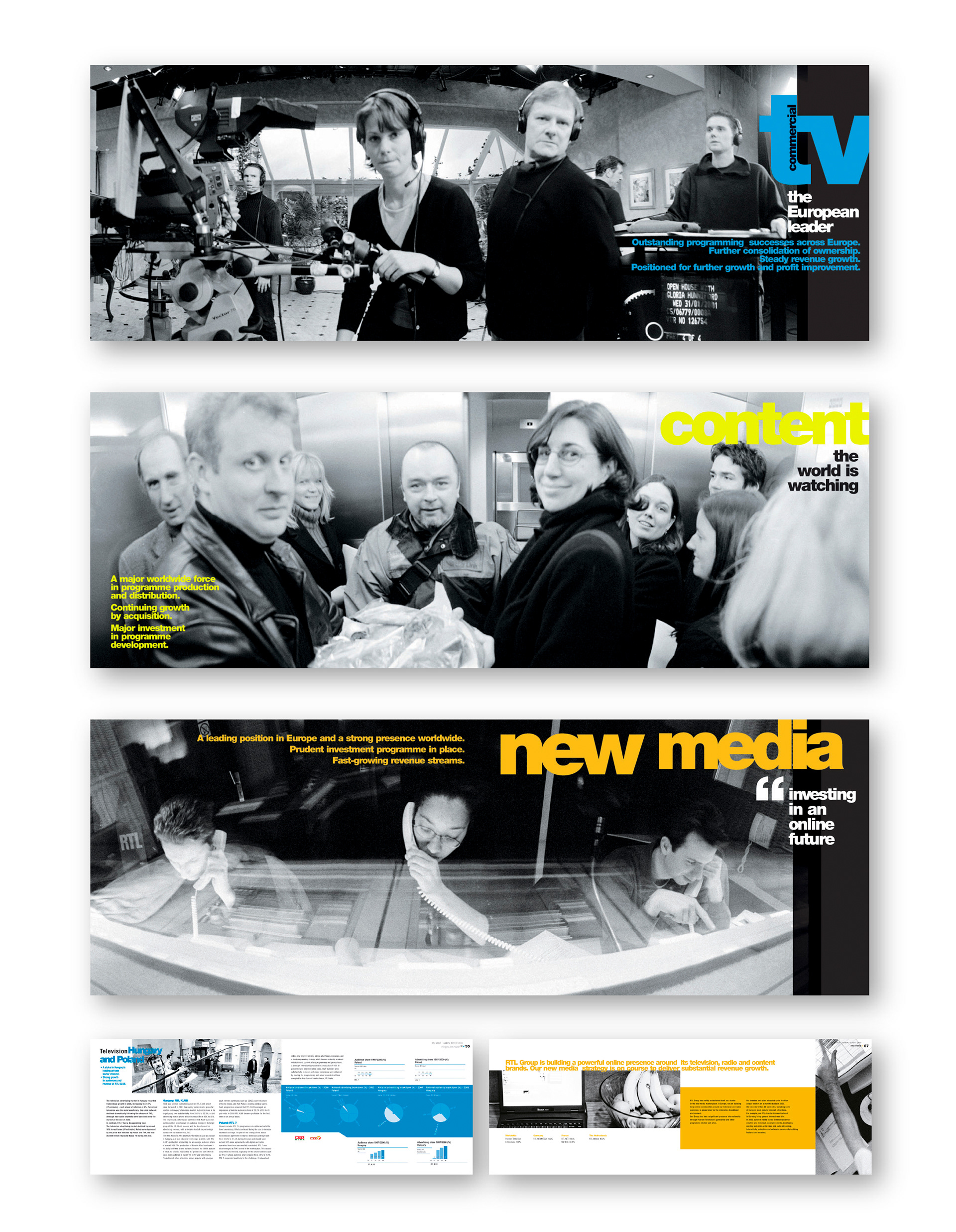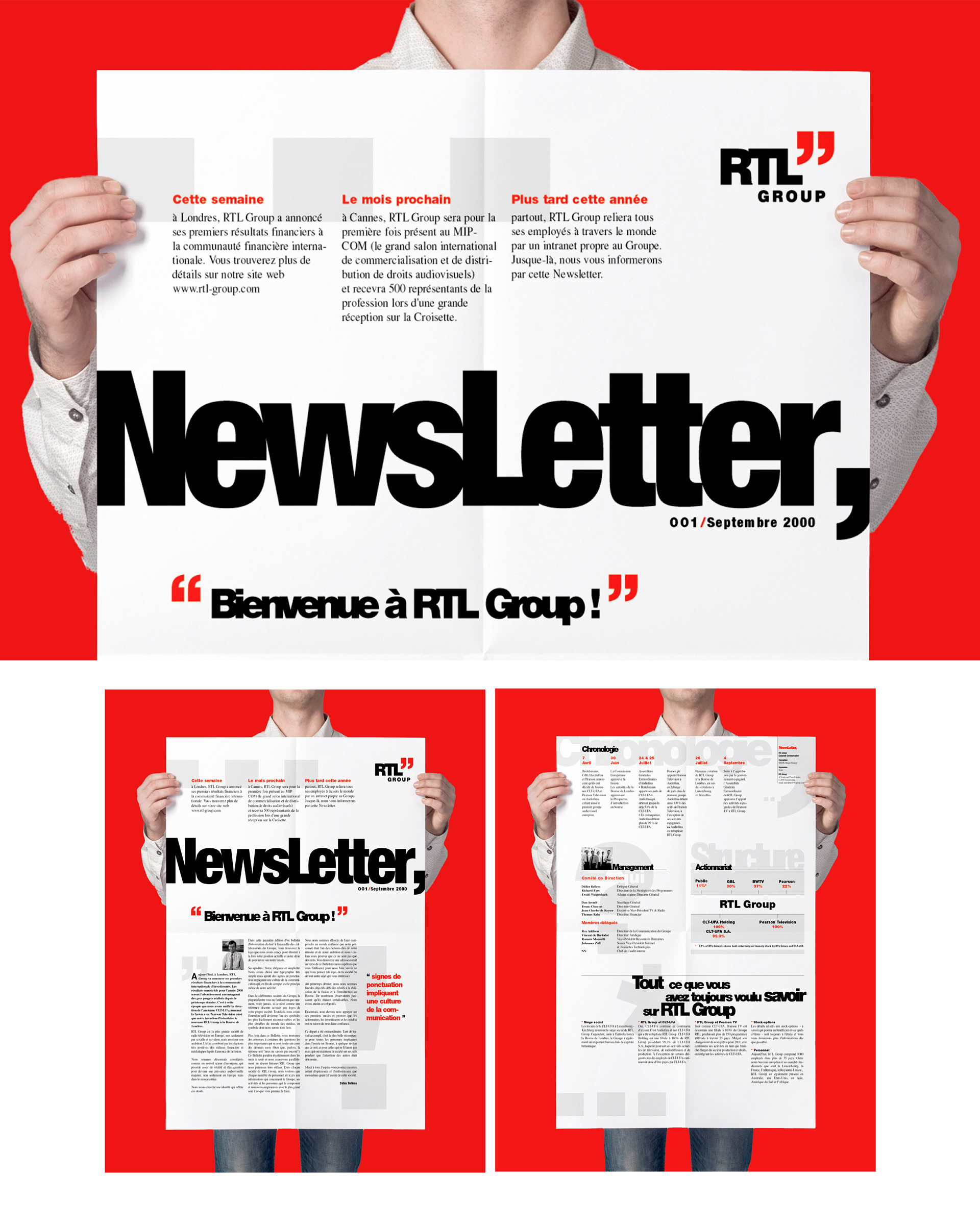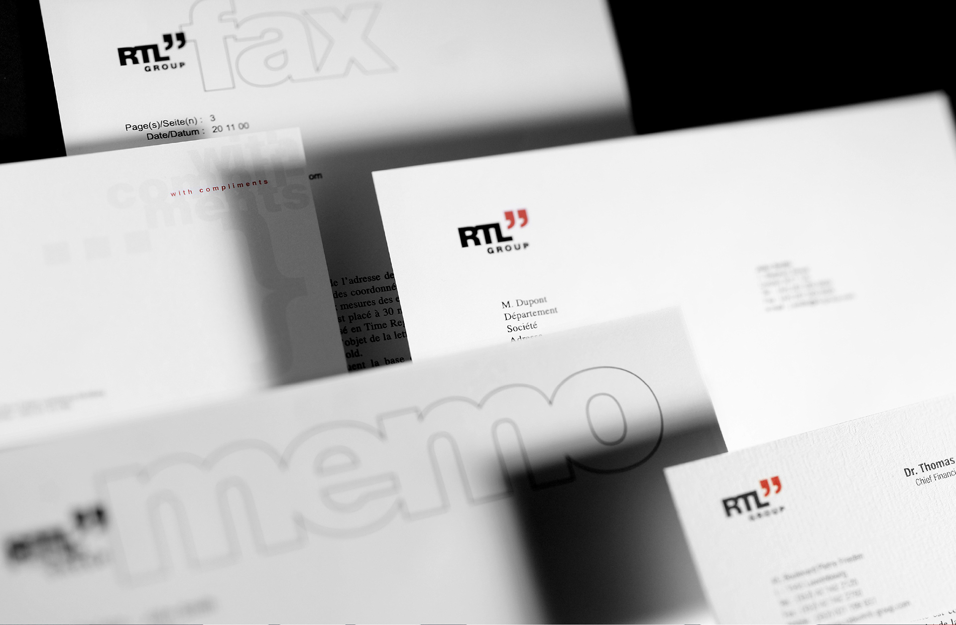 J'ai eu l'opportunité de créer l'identité visuelle de RTL Group et de diriger l'ensemble du projet artistique, couvrant tous les supports de communication de la marque : charte graphique, site web, affiches, annonces presse, rapports annuels et signalétique du siège au Luxembourg.